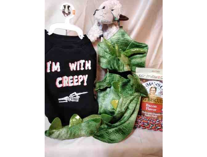 Does your dog channel an inner dinosaur or maybe a lama? Let them express their spirit animal this Halloween with this costume package created for a medium sized dog. An "I'm with Creepy" sweatshirt, toy and treats are also included.