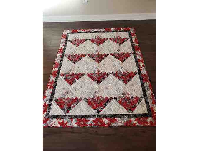 Both of the Log Cabin Christmas quilts have the same fabric and same blocks. They are simply traditional log cabin block arranged differently. A toouch of poinsetta and snow flaskes on the fabric is just the thing to add to your Christmas decor.