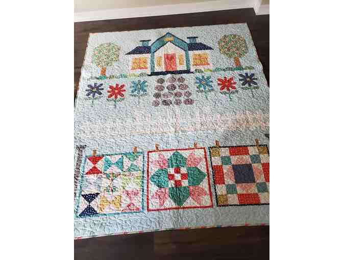 An 18 month labor of love. The scene depicts a lovely cottage with a clothesline out front which has 3 little mini quilts on it. This is truly a work of art.