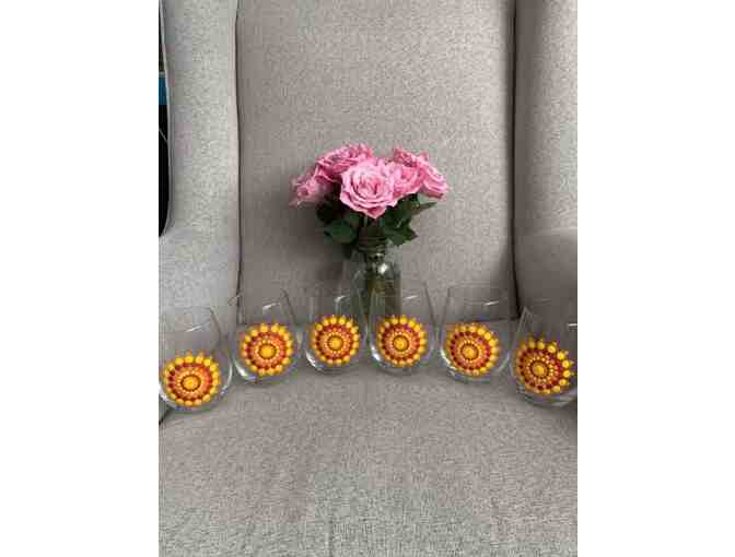 Beautiful hand-painted 12 oz stemless wine glasses. The unique and amazing mandala designs are in vibrant oranges and yellows to represent sunshine.
