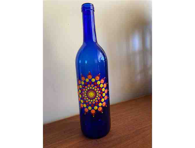 Beautiful handpainted blue glass wine bottle with mandala design in the reds, yellows and oranges of the sun! Comes with a cork and string lights to "Shine a Light" in your home. Also makes a great gift!