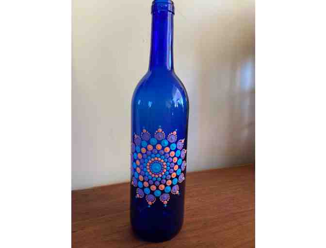 Beautiful handpainted mandala blue glass wine bottle shining with the logo colors of TANGO2- orange, blue, green and purple. Comes with a cork and string lights so you can "Shine a Light" in your home. Also makes a great gift!