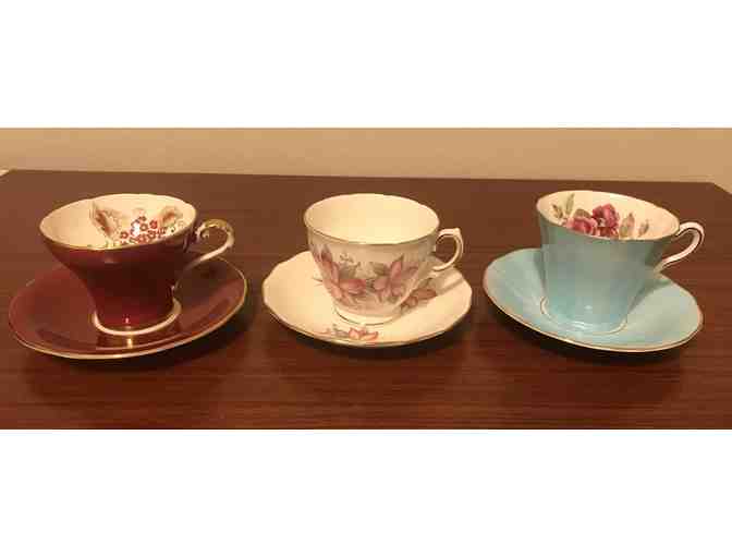 This set of bone china teacups is jut the thing for a fancy cup of tea or as decoration in your home. All in excellent condition. No cracks or chips.
