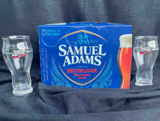 12 Cans of Sam Adams Boston Lager with two "perfect pint" Sam Adams Glasses. Glasses may vary from those in image