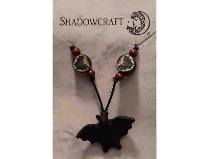 Bat necklace in molded clay, with 2 Fimo accent beads; adjusts to a maximum length of 24"