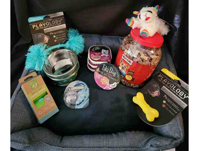 Soft dog bed holding milk-bone dog treats, toys, new bowls, sampling of wet foods, and poop bags. And of course, Lamb Chop, a dog's favorite toy!