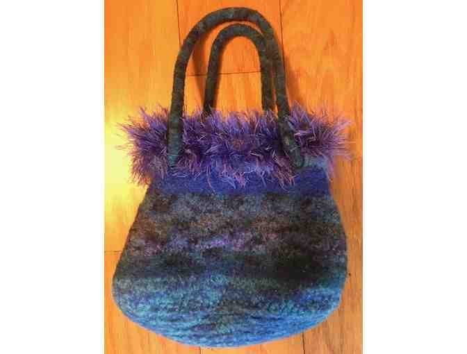 Beautifully knit and felted handbag by a local artisan. Shades of blue, lavender, tan with a fun purple frill. Pull the strap up and it becomes an attractive shoulder bag. If you like one-of-a-kind accessories, you'll love this! A great holiday gift for someone who appreciates artistry.