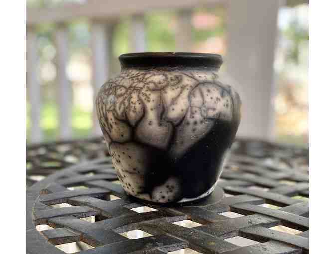 This raku pottery piece was handmade by a long-time FOHA volunteer. The unique finish was achieved using a process called "naked raku." The piece is covered with a protective clay slip and glaze, fired in an outdoor kiln and then placed in a reduction bin. The smoke from the reduction bin process permeates cracks in the protective slip-glaze, resulting in the unique black coloration on the piece's surface. No two pieces finished with this process will have the same appearance. This is truly a one-of-a-kind piece of art that will provide a great accent piece in your home or office.