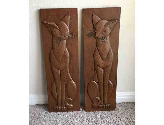 The Siamese cats have sleek lines, striking color contrasts, finely chiseled aristocratic heads, deep blue almond eyes, and short silky coats that truly make them living art. They have an acute intelligence, inquisitive personality and a loving nature. Perfectly brouht to life with these . These are so retro it hurts. Stylized Siamese cats ...yes, a matching pair of them...perfect for the cat lover and perfect to hang in your home. This pair are marked ©Burwood Products Co., USA. Each plaque measures a large 7 ½" x 24" and the Siamese cat design is raised. The back already contains a heavy saw-tooth hanger. Possibly the artist signature, (possibly the name of these lovely Siamese cat twins), each plaque is signed Arabesque.
