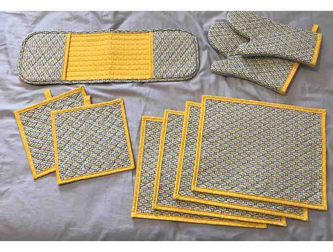 This adorable 9 piece kitchen decor set includes 4 placemats, 2 trivets, 2 oven mits, and 1 double oven mit. All the pieces feature a yellow and blue daisy pattern with yellow with white polka dot accents. The perfect house warming present or Christmas gift. All pieces have been created with care and they look like they will see a lot of use before they wear out.