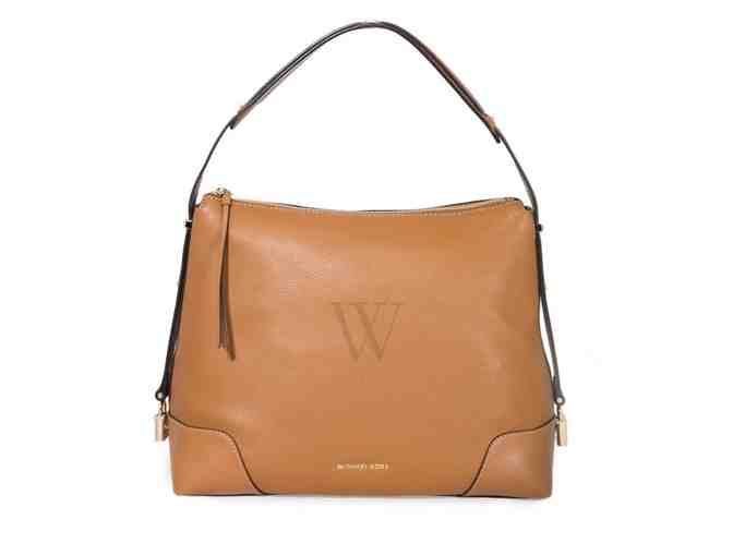A Michael Kors shoulder bag from the Crosby collection crafted in signature coated canvas with smooth leather panels and gold-tone hardware.