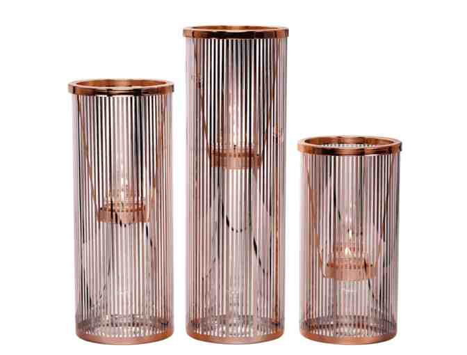 From PartyLite distributor Shari Waltersdorf comes this trio of candleholders (7", 9", and 11" high) made of rose-gold metal wrapped around glass. The pinstripe effect brings a sophisticated glow to December holiday decorating or any special event. Packaged with the trio are 2 dozen scented tealights.