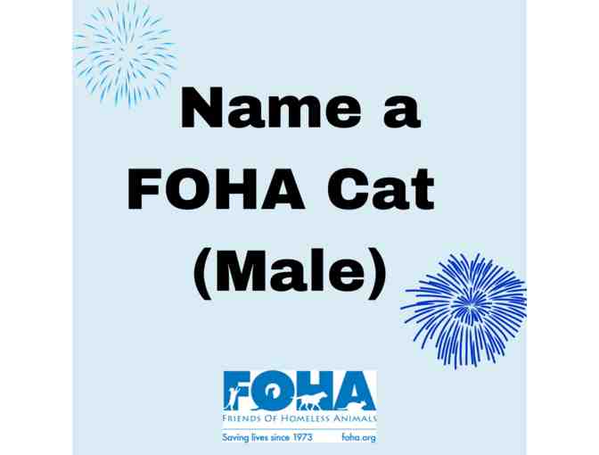 You are bidding for the unique honor of naming an incoming male cat at FOHA. We do intakes every other week. The winning bidder will be contacted before an upcoming intake to provide a name and two alternates for the cat. We will have a picture and provide age/weight information, but we probalby won't know much else about the cat.