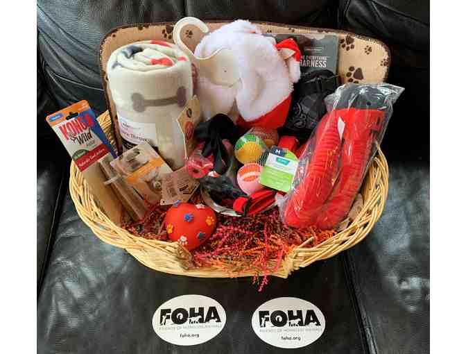 A basket of fun and useful items for a medium sized dog, including: