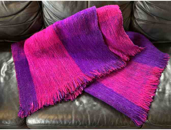 Gorgeous one-of-a-kind fuchsia and purple wool poncho. Drapes easily over your shoulders and cross crosses at your chest. Don’t be drab this winter. Dress with style. Would go well with large, colorful or silver/gold earrings. One size fits all.