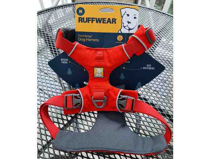 Foam-padded harness with two leash attachment options: an aluminum V-ring centered on the dog’s back, and reinforced front clip webbing at the chest to redirect dogs that pull. Four points of adjustment for optimal fit. ID pocket for dog tags, reflective trim, and light loop. 4.6 star rating on manufacturer’s website.