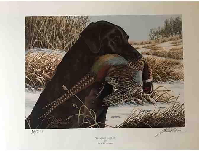 Enjoy this signed print depicting your favorite retreiver bringing you a Pheasant. Printed area is 10" by 14". Overall size is 15" by 19". Print is unframed. Hand signed by John Moisan.