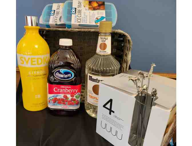 Basket includes bottle of Citron Svedka, Montezuma Triple Sec, Cranberry Juice, Silicone Ice Cube Trays, 4 Long Glasses, and Safari theme drink stirrers.