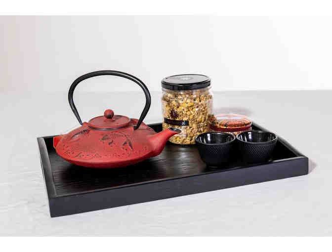 This gorgeous black serving tray showcases a red cast iron tea kettle, two cast iron tea cups, loose tea and an elegant candle