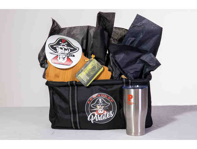 This canvas basket features a Pewaukee logo and includes a Wisconsin state bamboo cutting board and Pewaukee stainless steel tumbler
