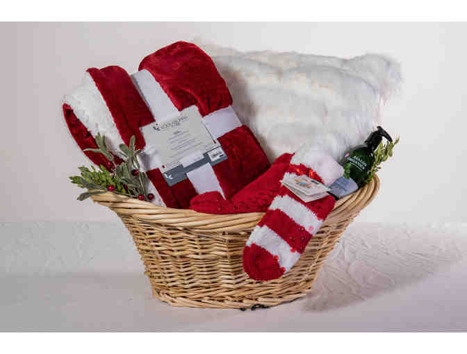 A basket brimming with holiday warmth. Stay cozy and stylish with this beautiful red Koolaburra by UGG Milo throw. Soft plush and sherpa reverse 50'' x 70'', UGG fuzzy pillow, Red and white winter socks and peppermint lotion