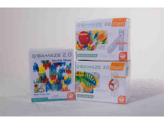 Q-BA-MAZE is a unique system of colorful cubes that interlock to form a marble run. The big difference? You can create marble maze sculptures in any form such as animals, robots, towers, and geometric shapes. Configurations are unlimited, allowing for unpredictable action when the steel marbles travel different routes. This package includes a Q-BA MAZE starter set, Q-BA MAZE Spin Stunt Set, Q-BA MAZE Bounce Stunt Set