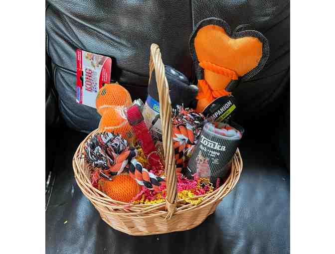 This delightful fall colors basket contains the following toys and accessories for your dog: