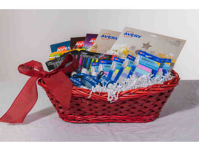 Basket filled with office essentials including Avery labels, pens and pencils