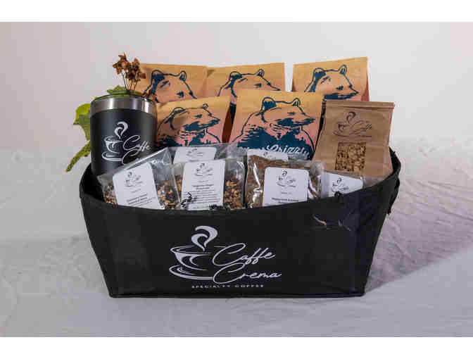 This basket really has it all! Sample five different whole bean coffees from Silver Grizzly Roasters in Texas, including Gradient blend, Guatemala Buena Esperanza, Up Top Blend and Colombia Santa Isabel. Also includes six assorted tea flavors, and granola. Oh, and we'll throw in a travel coffee tumbler.