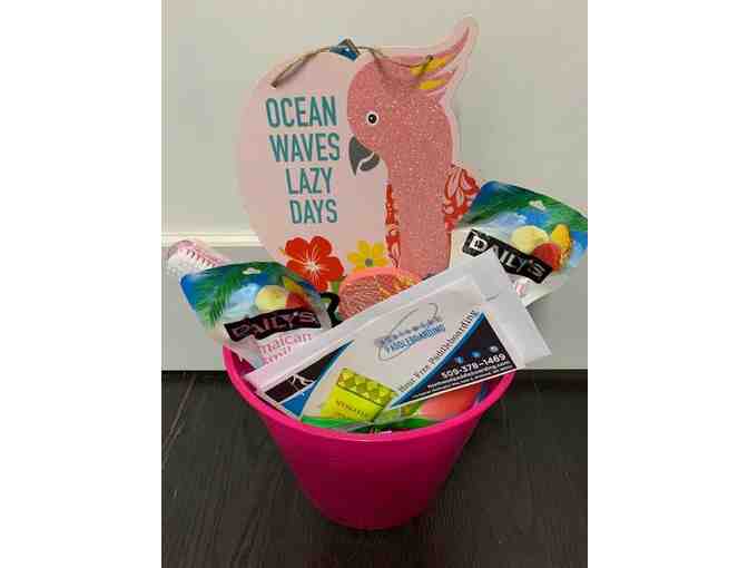 gift basket includes tropical themed decor items, face masks, lotion, lip gloss and candy along with Daily's Jamiacan Smile alcohol frozen cocktail pouches.