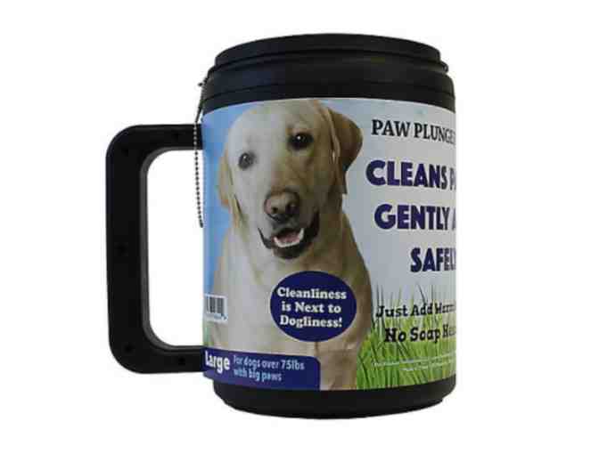 The Paw Plunger is a dog foot washer that removes mud, dirt, salt, sand, and more from your dog's paws and lower legs after walks and outside play. Keep dirty paws out of your home or car, and off your floors, carpet, and furniture. The Paw Plunger cleans your dog's paws quickly, reducing indoor mess and stains and preventing paw irritation from contaminates.