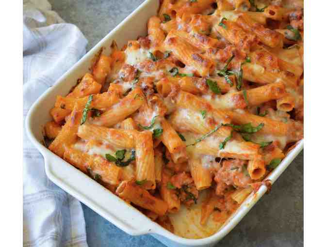 Jean will make you a delicious, homemade Ziti Dinner filling an 8- by 12-inch pan that will be ready to pop into the oven. Alternatively, it can be frozen for future use, such as when you come home exhausted and hungry after a day of Christmas shopping!