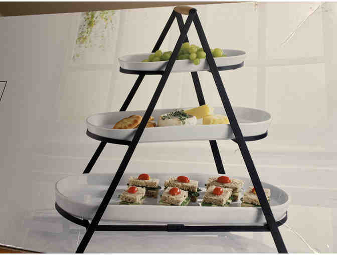 For all of your holiday get-togethers with family and friends, you will need this Serving Tower to make hosting a breeze! White oval porcelain trays in small, medium, and large sizes fit conveniently into a black metal stand. You will be able to show a variety of delicious appetizers or desserts in an elegant three-level presentation.