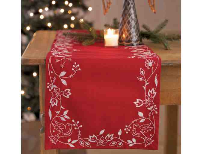 This gorgeous Christmas-red Holiday Table Runner was provided through SERRV International. The Table Runner features fine embroidery, accented with the bird of peace in each corner, and has tiny mirrorwork details. It measures 60 inches long by 12.75 inches wide.