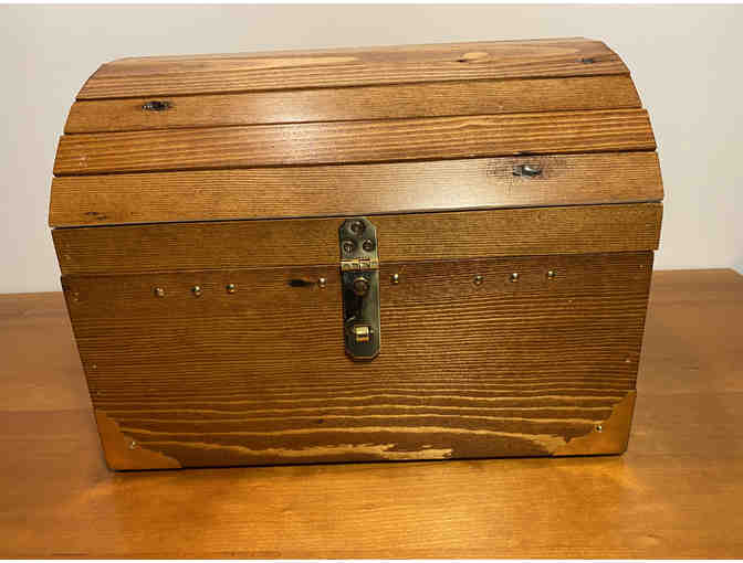 What child wouldn't love this handcrafted wooden Treasure Chest to store his or her medals and ribbons, fancy rocks, mementos from birthday parties, and more! The Treasure Chest measures 12 inches wide by 10 inches deep by 9 inches high at the highest point. It has brass hinges and brass corners. It also has a brass clasp to hold the lid securely shut and a brass chain to control how far the lid will open.