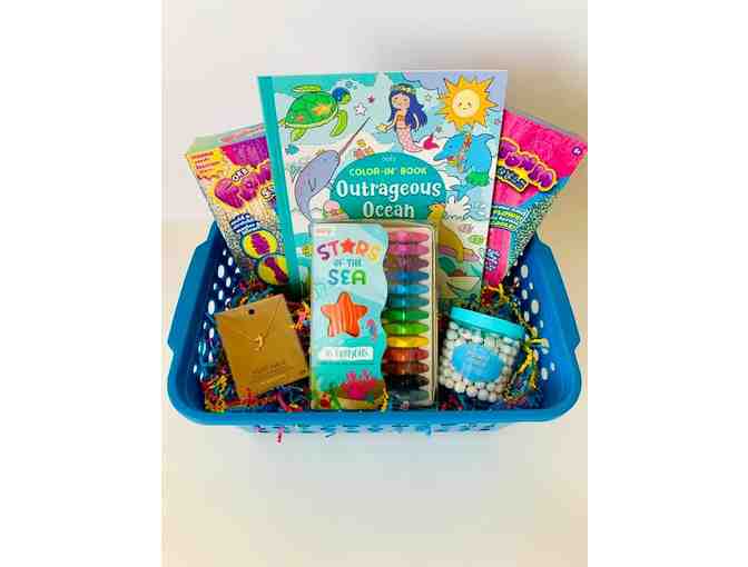 Gift basket includes Outrageous Ocean coloring book, Stars of the Sea starfish shaped crayons, pink and purple flowtonia (kinetic sand), mermaid necklace and chocolate mermaid pearls