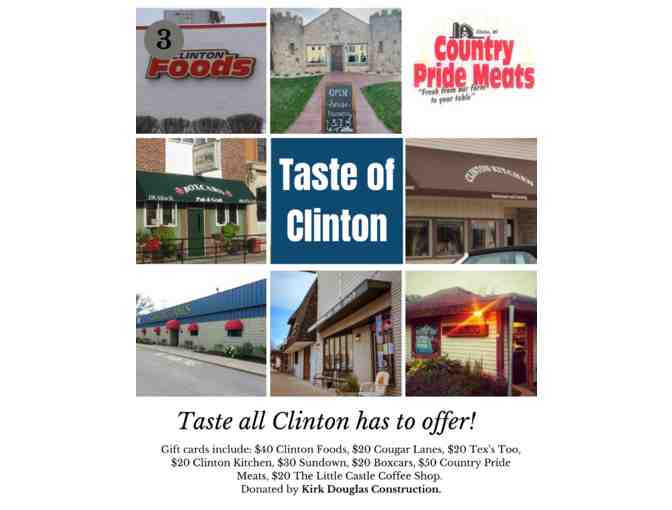 Gift cards include: $40 Clinton Foods, $20 Cougar Lanes, $20 Tex's Too, $20 Clinton Kitchen, $30 Sundown, $20 Boxcars, $50 Country Pride Meats, $20 The Little Castle Coffee Shop. Donated by Kirk Douglas Construction.