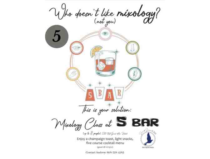 Enjoy a champagne toast, light snacks and a five course cocktail menu! You and up to 8 friends will learn how to make some great cocktails recipes to take home and impress your future guests! Donated by 5 Bar