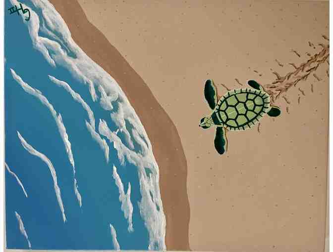 Artist Greg Heal has donated this lovely painting featuring a sea turtle on the beach.