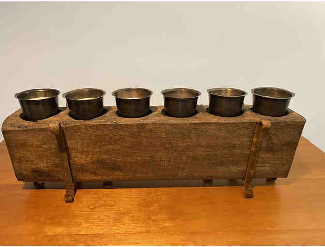 This 5-hole Mexican Sugar Mold Candle Holder makes a great rustic decor accent piece. Handmade from Spanish oak, the mold was originally used to form liquid sugar into cones known as pilloncillo. Pieces of the cones were then chipped away, as needed, for cooking. Two rustic brackets to hold the wooden mold, plus two sets of 5 conical candles each, are included with the Sugar Mold.