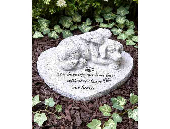 Be reminded of your beloved furbaby with this Pet Memorial Stone in your garden. The stone is shaped like a heart and the dog lying on it has wings. The inscription reads, "You have left our lives but will never leave our hearts."