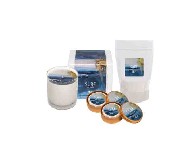 This package includes one Spa Day Surf Set handcrafted at the LIFT™ Workshop in Chicago by adults from disinvested and overlooked communities & overcoming barriers to fair wage employment. It contains 2 Aloe Glycerin Soaps, an 8.5 oz. Soy Candle in a Rocks Glass, and Bath Salts made with Pacific Sea Salt.