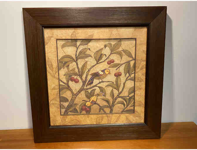 This drawing of two colorful birds perched in a cherry tree was done on textured paper. The print is in full color against a gold background inside the mat, and continues in a single tone of sepia on the gold-colored mat itself. The print is mounted in a dark wood frame.