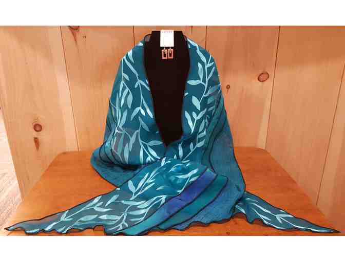 Elegant accessory duo created by local designers features a hand dyed silk scarf and sterling silver earrings.
