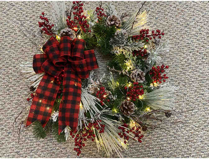 This 20-inch lifelike evergreen wreath is exquisitely embellished with snow-covered scotch pine needles, pinecones, ice-covered branches, lots of red berries, a large red plaid bow, and 50 LED lights. The lights are powered by 3 AA batteries (included). The lights can be turned on or off whenever you want, or they can run on a timer to be automatically on for 6 hours, then off for 18 hours, each day.
