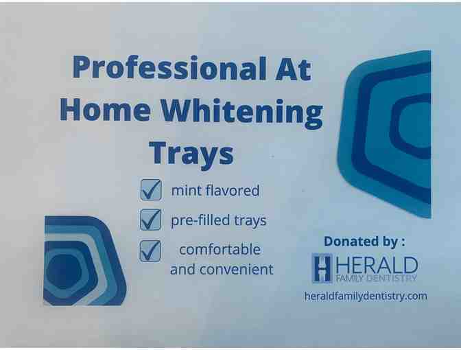 Professional at home teeth whitening trays that are mint flavored, pre-filled, comfortable and convenient donated by Herald Family Dentistry.