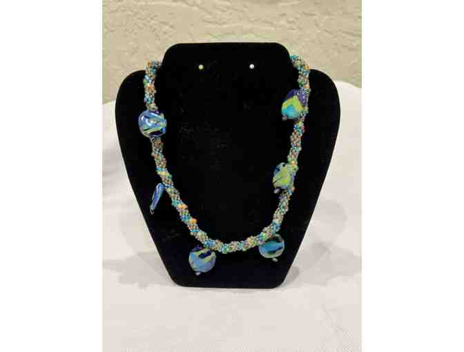 Beaded kumihimo necklace with variety of blue, green, and gold beads, and six dangling beads. 18" long.