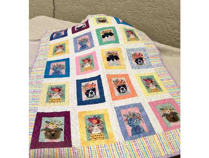 A bright, multicolored quilt featuring cats and dogs in flower crowns. Perfect for cuddling up with your pet!