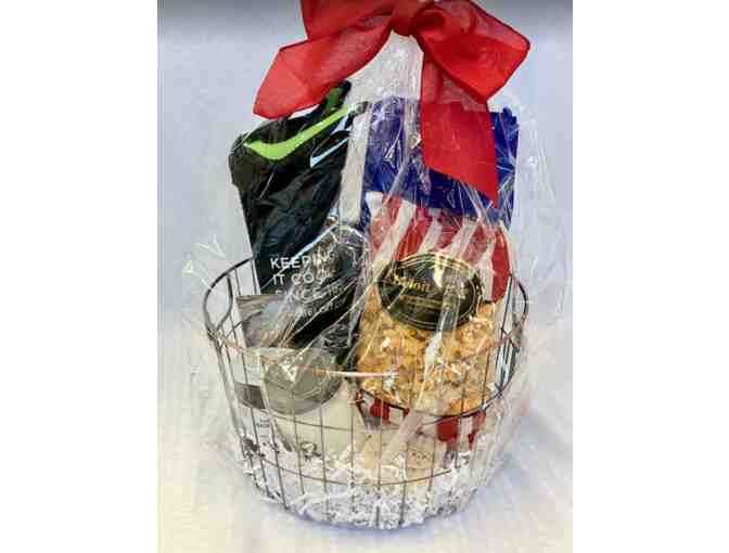 Variety of things from around the Beloit Area including Northwoods Gourmet Popcorn, Naked A.F. soap, 608 Walnut Creek Candle, Bushel & Peck Jam chocolate bar, Reusable bag, wine, and a wine koozie. Donated by Visit Beloit.