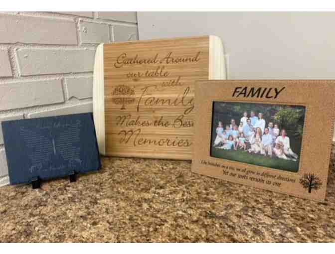Included in the basket is a cutting board with quote, a family photo, a poetic plaque, and a photo stand. Donated by Walnut Creek Apparel & Gifts.